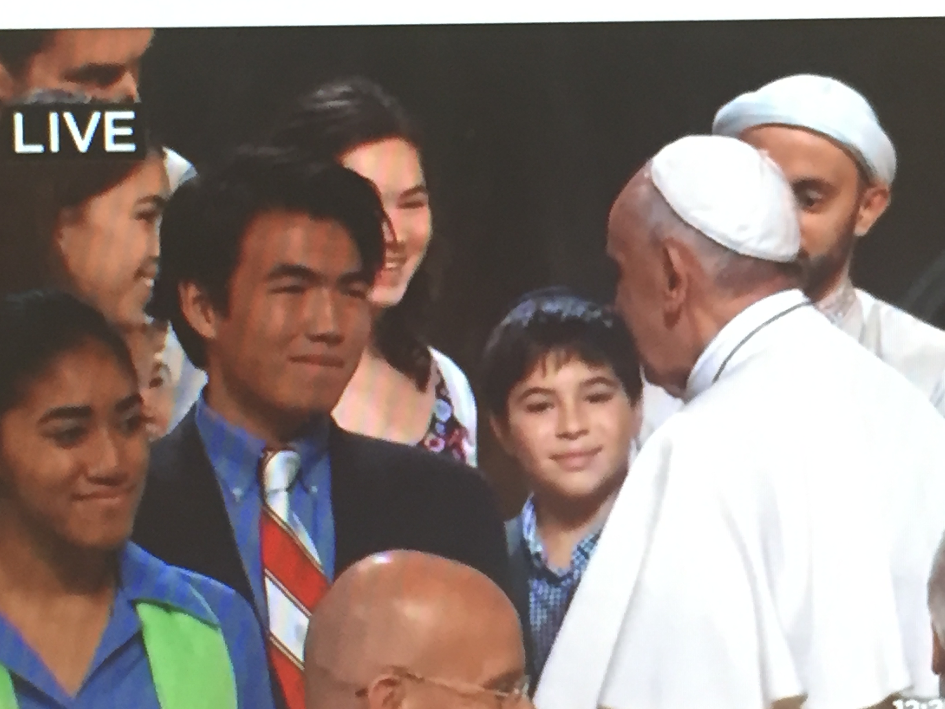 My warmest memory of all from yesterday relates not directly to the pope, but to my dear friend His Eminence Cardinal Dolan, to whom the city of New York owes a great debt of gratitude for his inspired leadership. The formal part of the program had ended, and as participants were greeting each other, the pope stood for pictures with assorted dignitaries. Off to the side, Cardinal Dolan and I greeted each other warmly, and he said, “Elliot, aren’t your children here?” When I signaled to him where they were sitting, Cardinal Dolan insisted, “Well bring them up here, they should be up here!” I turned around, caught my children’s eye, waved them over, and to make a long story short, was able to give them each the gift of a handshake and smile from the pope that they will never forget.