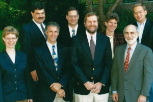 Back row: John Lande, David Jones, Glenn Sigurdson, Paddy Moore. Front row: Mike Hughes, Cliff Hendler, Michelle LeBaron, John Stephens.