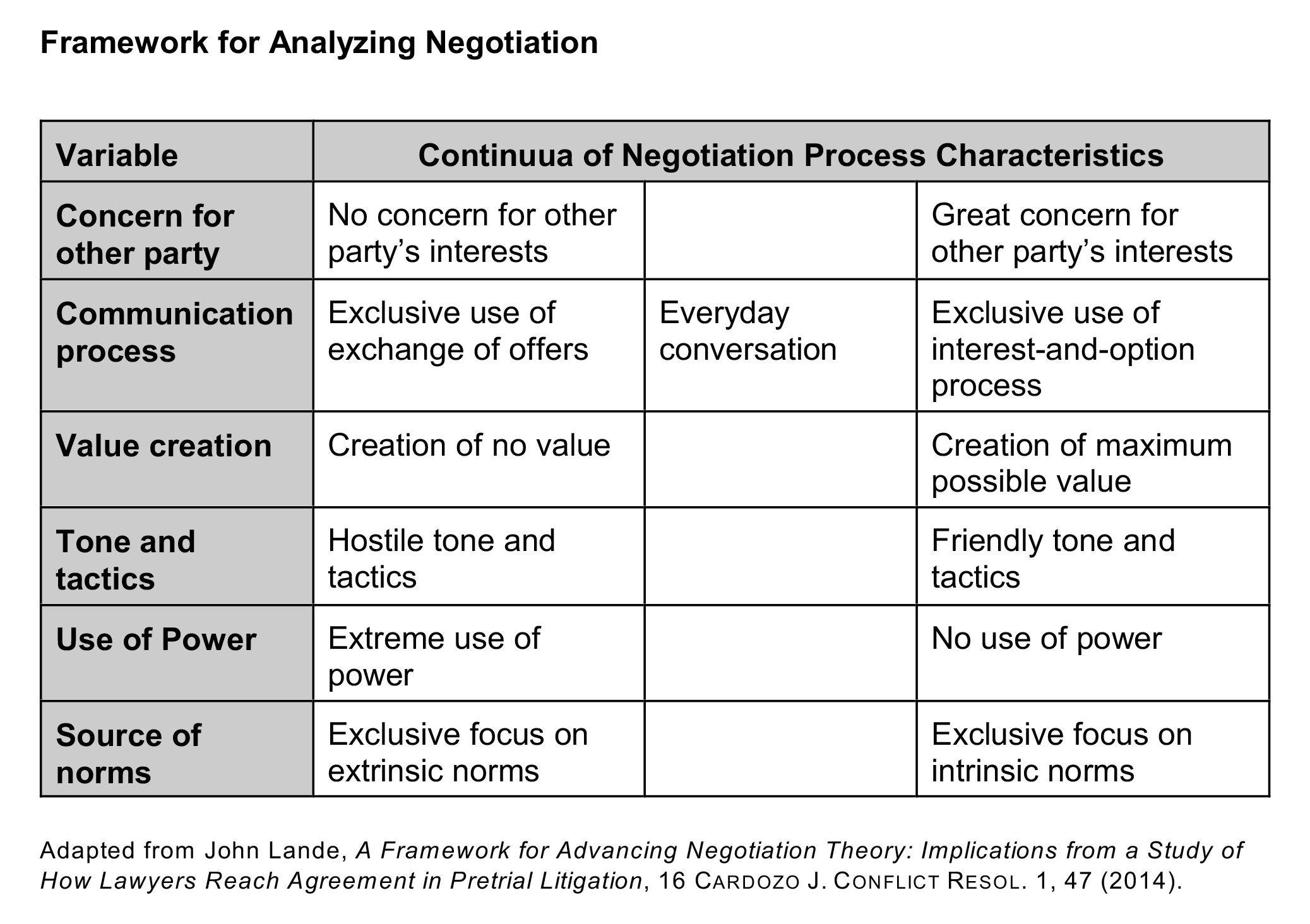 The following table adapted from my article identifies six variables that law school negotiation texts refer to when defining the two basic models. In analyzing accounts of actual pretrial negotiations, I found that there seemed to be a strong relationship between these variables in some cases but not in others.