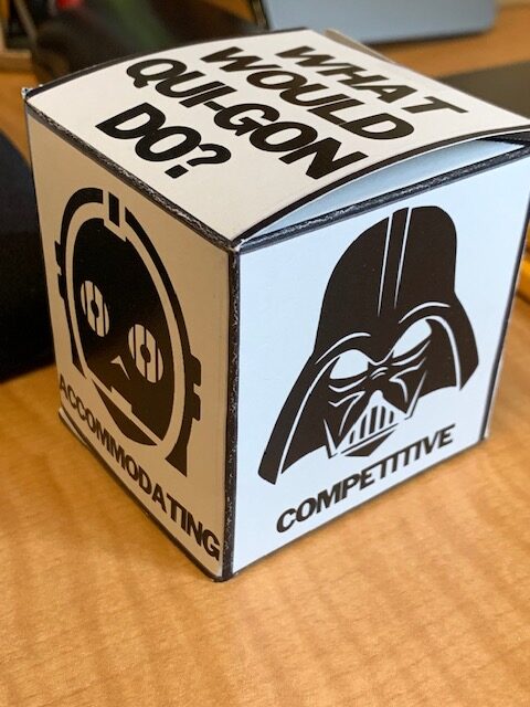 Our panel, “Conflict Resolution Through Star Wars,” ended up with over 100 attendees. It was really gratifying to discover that so many non-ADR professionals want to learn about conflict and dealing with conflict. Liz Tippett helped us make these cool shirts. And we also made little “conflict-crons” (inspired by the Jedi holocrons from Star Wars) with conflict modes on four sides. They were a big hit.