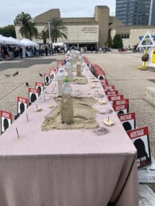 I had visited Hostages Square before, on November 5th, 2023, less than thirty days after October 7th. What greeted me then, and what now stood before me, were stark reminders of the inexorable passage of time. The long Shabbat table that symbolized the hostages in Gaza, the first installation in the square, was now divided — about two-thirds of the seats were set at a beautiful table, with a sign on each plate reading “Welcome Home,” while the remaining seats, including two high chairs for infants, were rugged, a desolate scene strewn with detritus and deprivation, with dirt and contaminated water bottles, symbolizing the hostages that remain in Gaza spending yet another week away from their homes and loved ones.