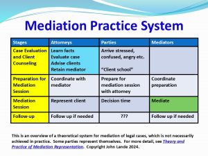 I also posted Real Practice System Menu of Checklists for Attorneys in Mediation, which complements the menu of checklists for mediators. There is substantial overlap between the two sets of checklists, with some significant differences. You and your students might be interested to compare the two sets of checklists and use them in simulations.